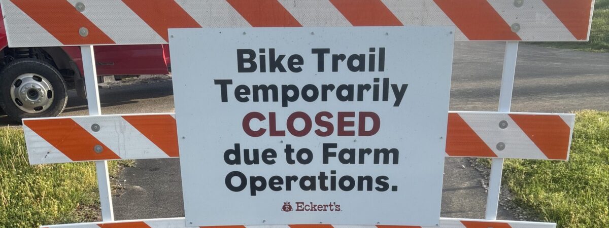 Due to farm crop management activities the Orchard Loop will be closed until approximately 12 noon today, April 17. Upon completion of the crop management the trail will be reopened. Signs are posted warning of the trail closure. We apologize for the inconvenience and we appreciate your patience.